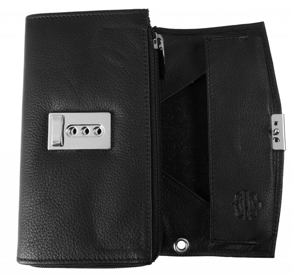 Disposição: compartimento grande para moedas, compartimento para moedas com fecho e três compartimentos para cartões de crédito, cinco compartimentos para notas, um bolso externo adicional