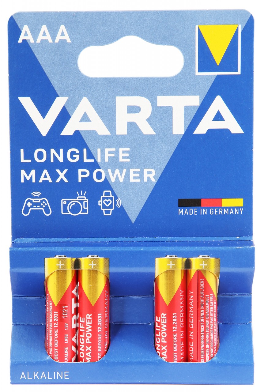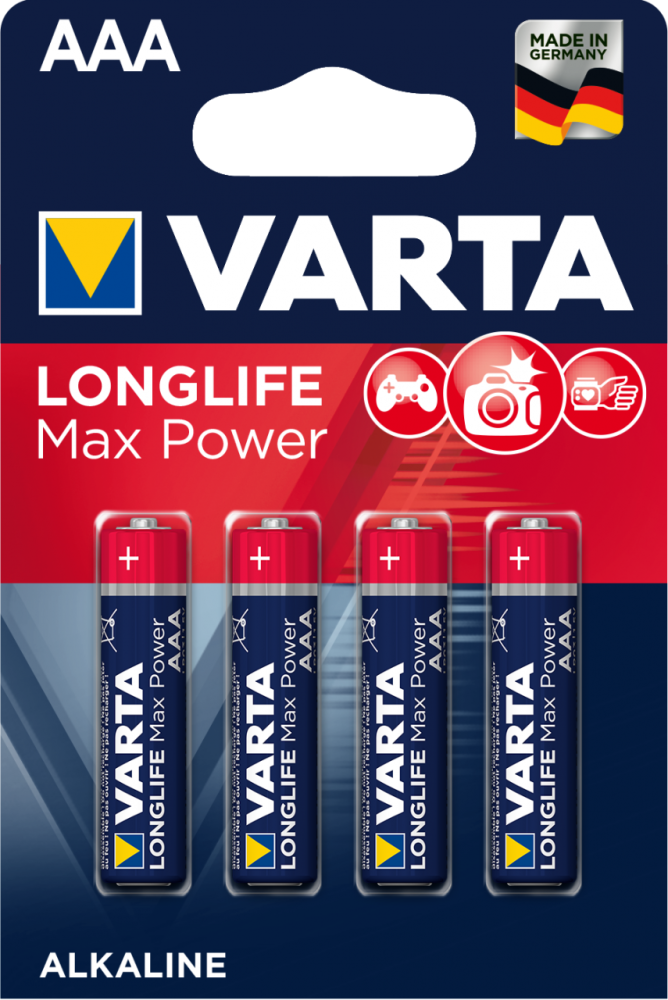 Pilhas Varta Alcalinas de Longa Duração AAA. Embalagem de 4 unidades.