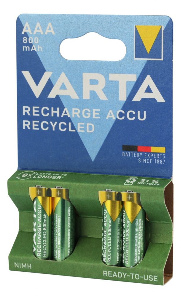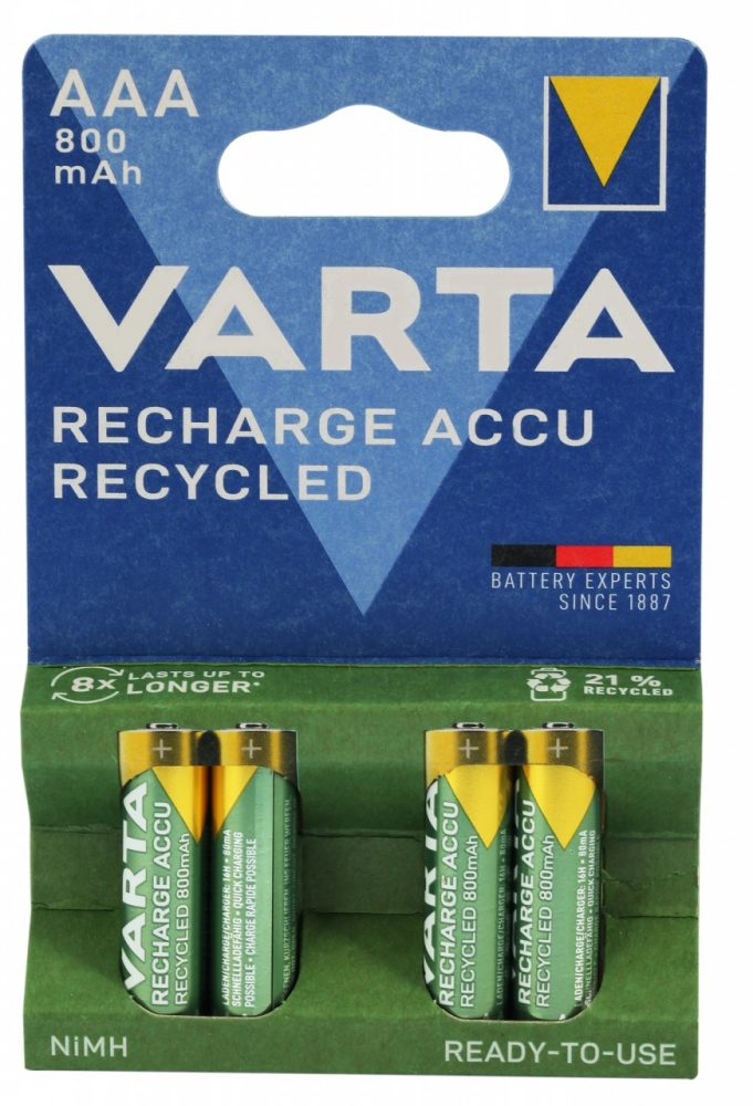 Pilhas Varta Recicladas Recarregáveis AAA. Embalagem de 4 unidades.