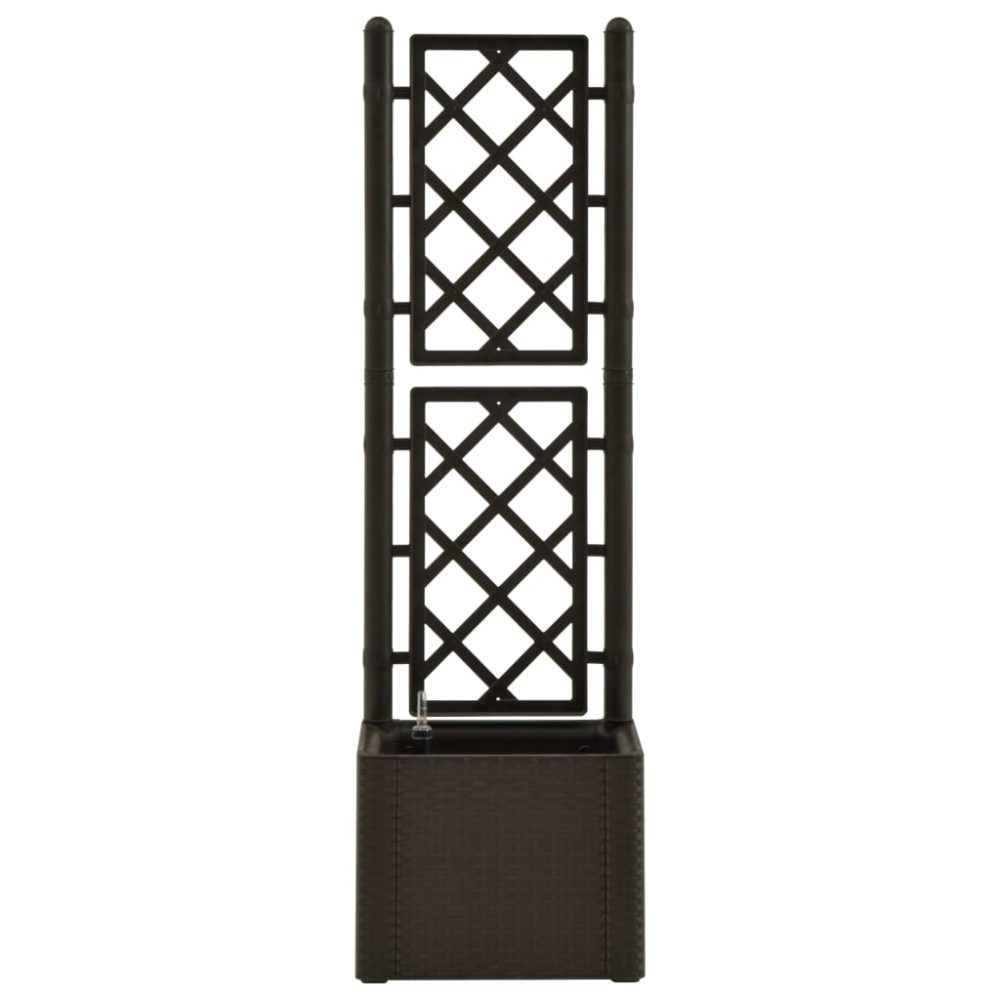 A treliça embutida oferece um excelente suporte para plantas trepadeiras, tais como ervas, tomates, feijões, etc. Feita de plástico robusto resistente aos raios UV, clima e geada, é adequada para utilização interna e externa. O design assemelha-se a uma estrutura de vime muito real. O material é lavável e fácil de limpar. Esta caixa pode regar automaticamente as plantas, que absorvem a humidade a partir do seu reservatório de água de 35 L. Possui orifícios de escoamento para evitar o excesso de água. O indicador de nível está incluído.