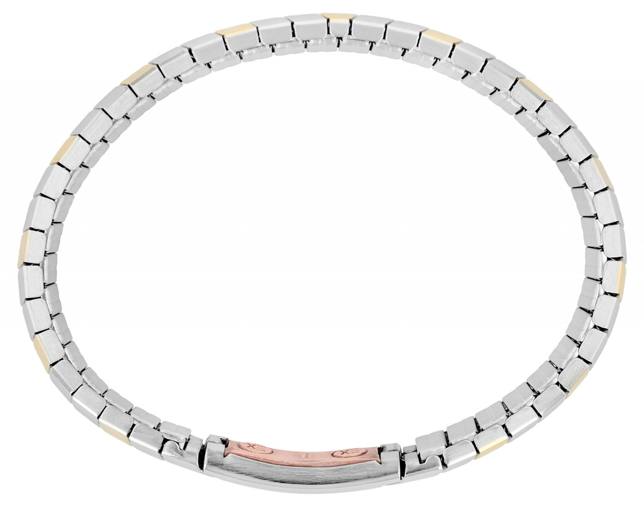 Vittoria, uma pulseira para seu bem-estar. A pulseira feminina flexível feita de aço inoxidável da marca Akzent está disponível em quatro versões.<br< O especial da pulseira é que há dois elementos magnéticos de cobre incorporados na parte interna da pulseira. A combinação de cobre e ímãs é tradicionalmente valorizada por suas propriedades positivas: – O cobre é considerado um material comprovado na naturopatia e é frequentemente associado a um efeito de suporte nas articulações e na circulação sanguínea. – De acordo com os usuários, os ímãs podem ter um efeito relaxante e ajudar a promover o equilíbrio do corpo. Variantes -001 Circunferência: 17 cm, largura: 7 mm, placa de gravação, bicolor -002 Circunferência: 17 cm, largura: 6,5 mm, placa de gravação, prateada -003 Circunferência: 17,5 cm, largura: 7 mm, bicolor -004 Circunferência: 17 cm, largura: 7 mm, elementos de gravação, acabamento similar, prateada