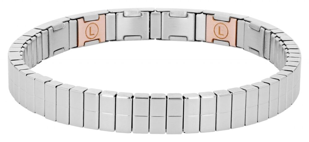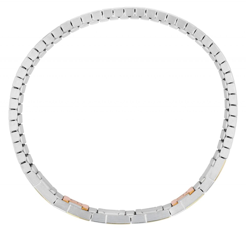 Vittoria, uma pulseira para seu bem-estar. A pulseira feminina flexível feita de aço inoxidável da marca Akzent está disponível em quatro versões.<br< O especial da pulseira é que há dois elementos magnéticos de cobre incorporados na parte interna da pulseira. A combinação de cobre e ímãs é tradicionalmente valorizada por suas propriedades positivas: – O cobre é considerado um material comprovado na naturopatia e é frequentemente associado a um efeito de suporte nas articulações e na circulação sanguínea. – De acordo com os usuários, os ímãs podem ter um efeito relaxante e ajudar a promover o equilíbrio do corpo. Variantes -001 Circunferência: 17 cm, largura: 7 mm, placa de gravação, bicolor -002 Circunferência: 17 cm, largura: 6,5 mm, placa de gravação, prateada -003 Circunferência: 17,5 cm, largura: 7 mm, bicolor -004 Circunferência: 17 cm, largura: 7 mm, elementos de gravação, acabamento similar, prateada
