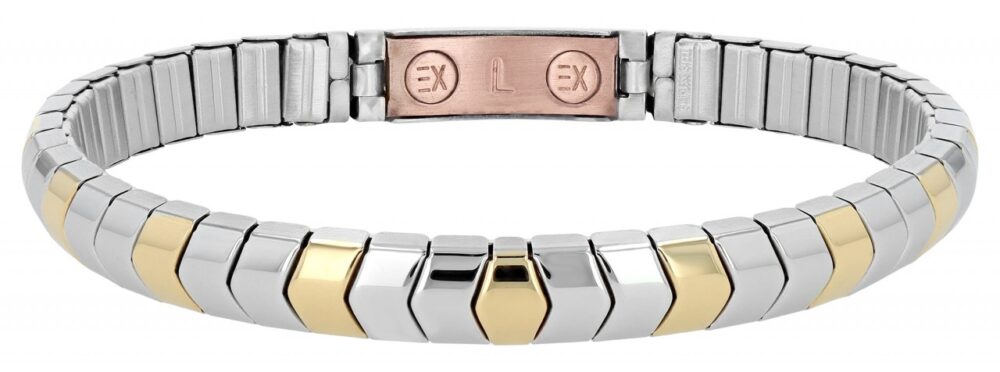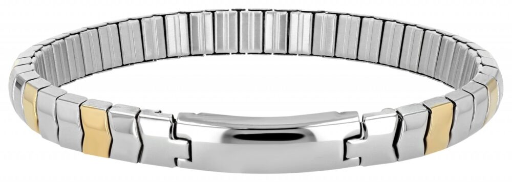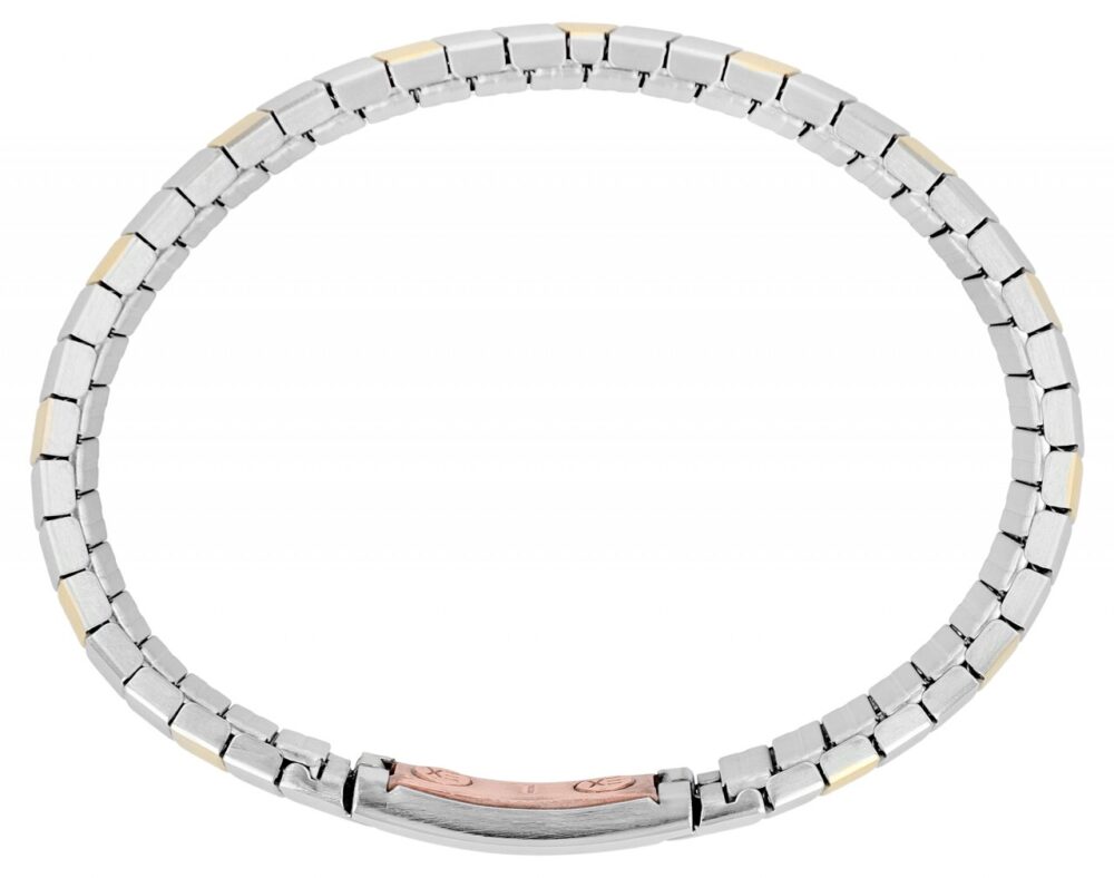 Vittoria, uma pulseira para seu bem-estar. A pulseira feminina flexível feita de aço inoxidável da marca Akzent está disponível em quatro versões.<br< O especial da pulseira é que há dois elementos magnéticos de cobre incorporados na parte interna da pulseira. A combinação de cobre e ímãs é tradicionalmente valorizada por suas propriedades positivas: – O cobre é considerado um material comprovado na naturopatia e é frequentemente associado a um efeito de suporte nas articulações e na circulação sanguínea. – De acordo com os usuários, os ímãs podem ter um efeito relaxante e ajudar a promover o equilíbrio do corpo. Variantes -001 Circunferência: 17 cm, largura: 7 mm, placa de gravação, bicolor -002 Circunferência: 17 cm, largura: 6,5 mm, placa de gravação, prateada -003 Circunferência: 17,5 cm, largura: 7 mm, bicolor -004 Circunferência: 17 cm, largura: 7 mm, elementos de gravação, acabamento similar, prateada