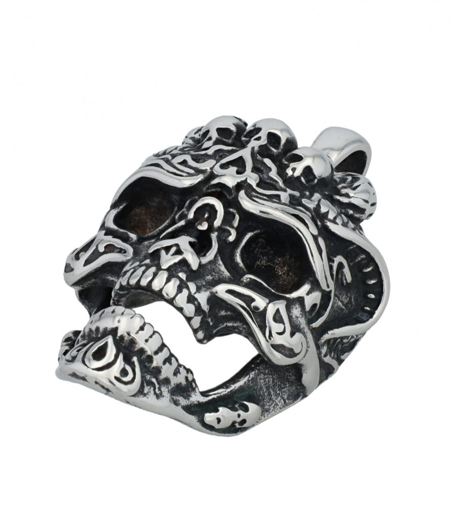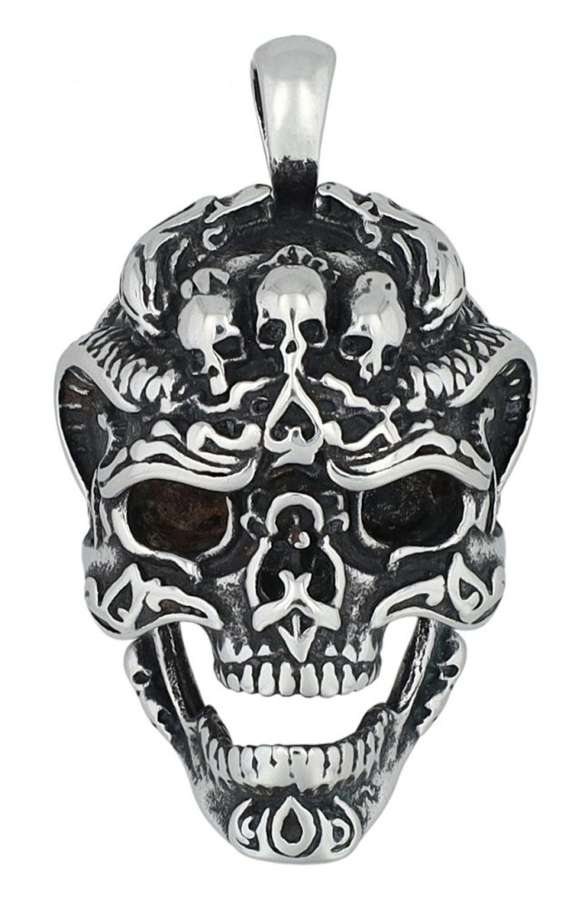 O pingente de caveira feito de aço inoxidável maciço, disponível em uma impressionante versão prateada com tons pretos. Com comprimento de 5 x 2,9 cm, incluindo o ilhó fixo, “William” chama imediatamente a atenção. A caveira é decorada com detalhes especiais que realçam seu aspecto escuro e lhe conferem um toque diferenciado. A alça do pingente tem dimensões internas de 8 x 5 mm, que se ajustam perfeitamente à nossa corrente sólida correspondente. No entanto, observe que não fornecemos uma corrente com o pingente para garantir que você possa expressar totalmente o seu estilo individual.