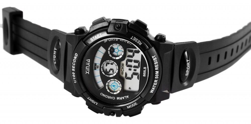 O relógio de pulso digital da marca Xinjia apresenta um movimento de quartzo de alta qualidade. A pulseira de silicone tem 23 mm de largura nas hastes e pode ser aberta e fechada com uma fivela de aço inoxidável prateada. O comprimento total do relógio é de 24,5 cm. A caixa de plástico tem um diâmetro de 44 mm e uma altura de 17 mm. É particularmente robusto contra choques e vibrações. A parte traseira da caixa é feita de aço inoxidável e é fixada à caixa com quatro parafusos de aço inoxidável. O relógio tem uma resistência à água de 5 bar. A hora digital pode ser ajustada usando os quatro botões localizados às duas,…
