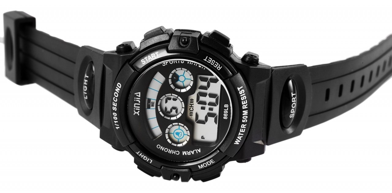 O relógio de pulso digital da marca Xinjia apresenta um movimento de quartzo de alta qualidade. A pulseira de silicone tem 23 mm de largura nas hastes e pode ser aberta e fechada com uma fivela de aço inoxidável prateada. O comprimento total do relógio é de 24,5 cm. A caixa de plástico tem um diâmetro de 44 mm e uma altura de 17 mm. É particularmente robusto contra choques e vibrações. A parte traseira da caixa é feita de aço inoxidável e é fixada à caixa com quatro parafusos de aço inoxidável. O relógio tem uma resistência à água de 5 bar. A hora digital pode ser ajustada usando os quatro botões localizados às duas, quatro, oito e dez horas. Todas as outras funções, como a iluminação do visor, a função cronômetro, o timer, a função de alarme, um segundo fuso horário e um sinal acústico de ritmo, também podem ser definidas usando os botões.