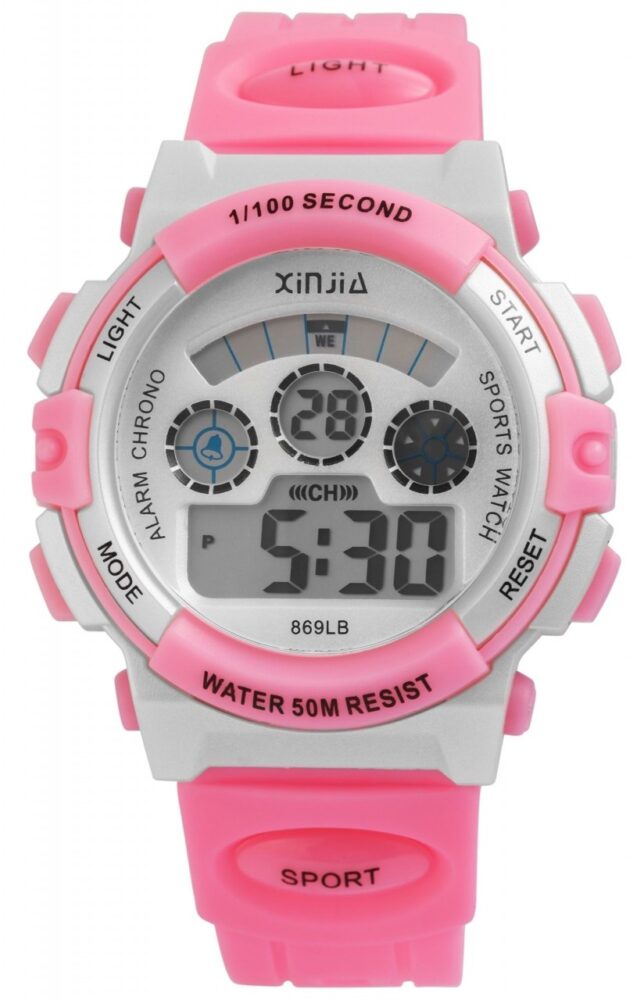 O relógio de pulso digital da marca Xinjia apresenta um movimento de quartzo de alta qualidade. A pulseira de silicone tem 23 mm de largura nas hastes e pode ser aberta e fechada com uma fivela de aço inoxidável prateada. O comprimento total do relógio é de 24,5 cm. A caixa de plástico tem um diâmetro de 44 mm e uma altura de 17 mm. É particularmente robusto contra choques e vibrações. A parte traseira da caixa é feita de aço inoxidável e é fixada à caixa com quatro parafusos de aço inoxidável. O relógio tem uma resistência à água de 5 bar. A hora digital pode ser ajustada usando os quatro botões localizados às duas, quatro, oito e dez horas. Todas as outras funções, como a iluminação do visor, a função cronômetro, o timer, a função de alarme, um segundo fuso horário e um sinal acústico de ritmo, também podem ser definidas usando os botões.