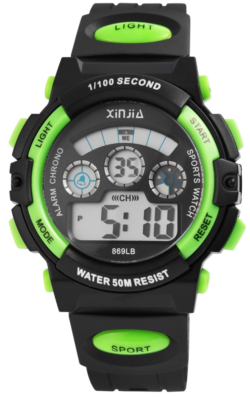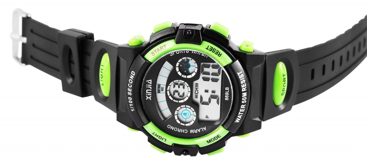O relógio de pulso digital da marca Xinjia apresenta um movimento de quartzo de alta qualidade. A pulseira de silicone tem 23 mm de largura nas hastes e pode ser aberta e fechada com uma fivela de aço inoxidável prateada. O comprimento total do relógio é de 24,5 cm. A caixa de plástico tem um diâmetro de 44 mm e uma altura de 17 mm. É particularmente robusto contra choques e vibrações. A parte traseira da caixa é feita de aço inoxidável e é fixada à caixa com quatro parafusos de aço inoxidável. O relógio tem uma resistência à água de 5 bar. A hora digital pode ser ajustada usando os quatro botões localizados às duas, quatro, oito e dez horas. Todas as outras funções, como a iluminação do visor, a função cronômetro, o timer, a função de alarme, um segundo fuso horário e um sinal acústico de ritmo, também podem ser definidas usando os botões.