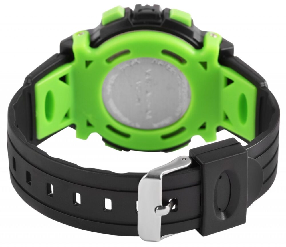 O relógio de pulso digital da marca Xinjia apresenta um movimento de quartzo de alta qualidade. A pulseira de silicone tem 23 mm de largura nas hastes e pode ser aberta e fechada com uma fivela de aço inoxidável prateada. O comprimento total do relógio é de 24,5 cm. A caixa de plástico tem um diâmetro de 44 mm e uma altura de 17 mm. É particularmente robusto contra choques e vibrações. A parte traseira da caixa é feita de aço inoxidável e é fixada à caixa com quatro parafusos de aço inoxidável. O relógio tem uma resistência à água de 5 bar. A hora digital pode ser ajustada usando os quatro botões localizados às duas,…