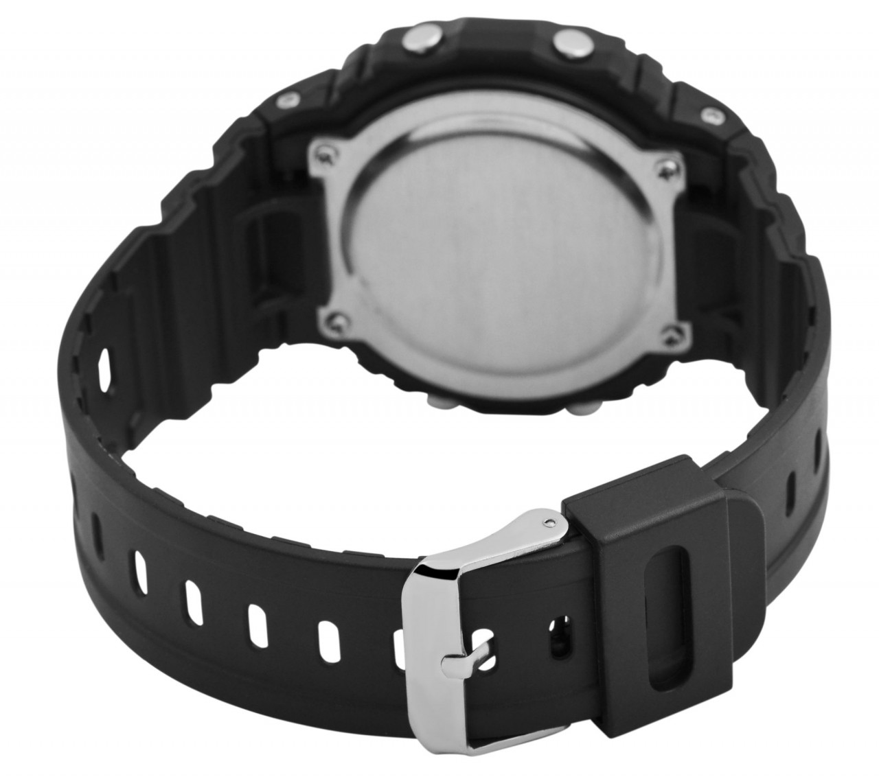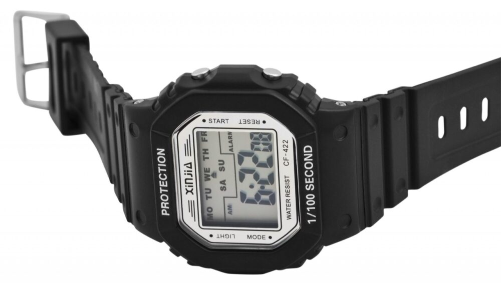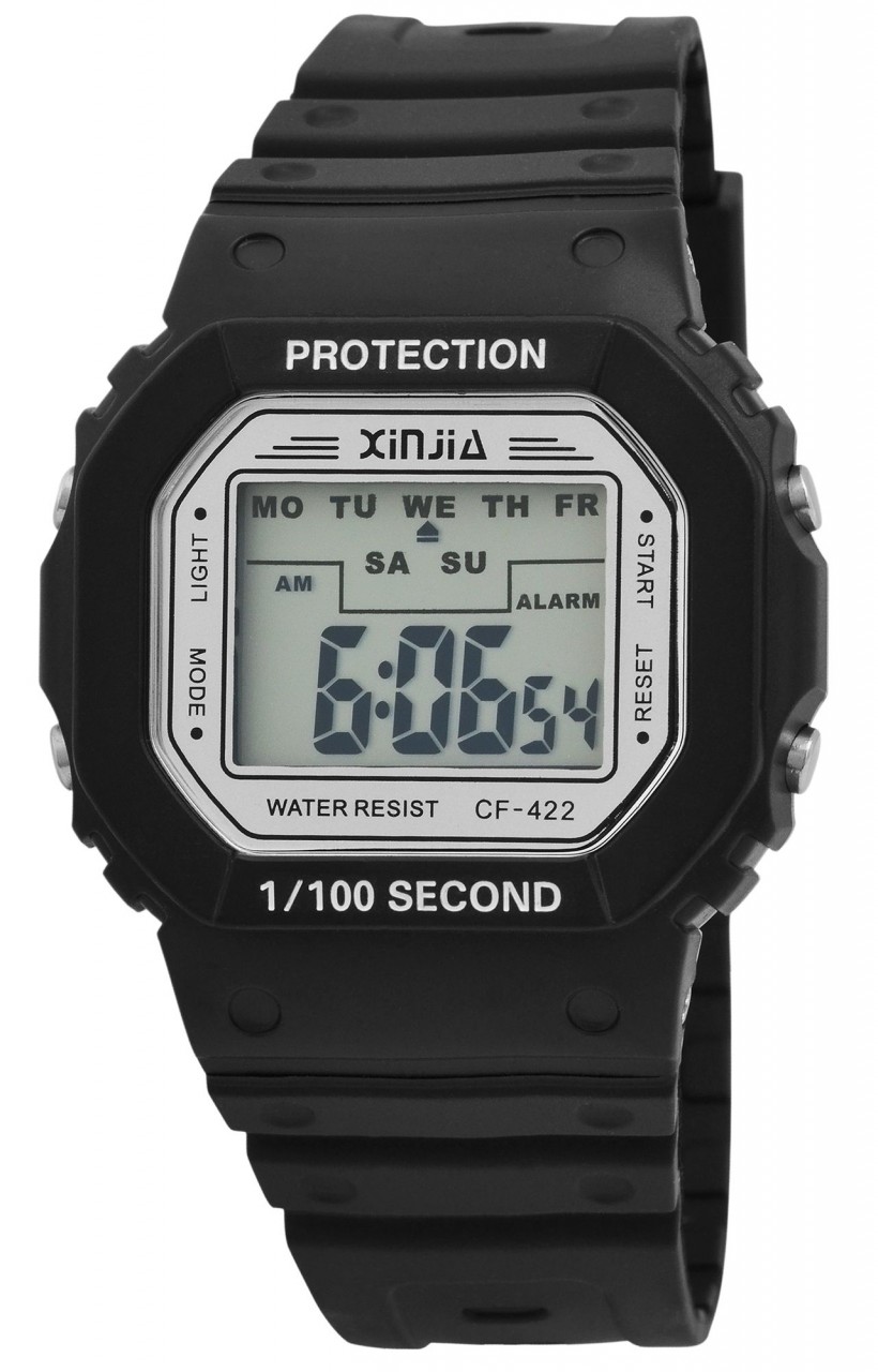 O relógio digital unissexo da marca Xinjia apresenta um movimento digital de alta qualidade. A pulseira de silicone tem 30 mm de largura nas hastes e pode ser aberta e fechada com uma fivela prateada. O comprimento total do relógio é de 24 cm. A caixa de plástico mede 34 mm de comprimento, 44 mm de largura e 12 mm de altura. O relógio é particularmente robusto contra choques e vibrações. A parte traseira da caixa é feita de aço inoxidável e é fixada à caixa com quatro parafusos de aço inoxidável. A hora digital pode ser ajustada usando quatro botões, que são colocados em intervalos iguais na borda externa da caixa. Todas as outras funções, como a iluminação do visor, a função cronômetro e a função alarme, também podem ser ajustadas usando os botões. Graças à função de luz, a hora pode ser vista com clareza, mesmo no escuro.
