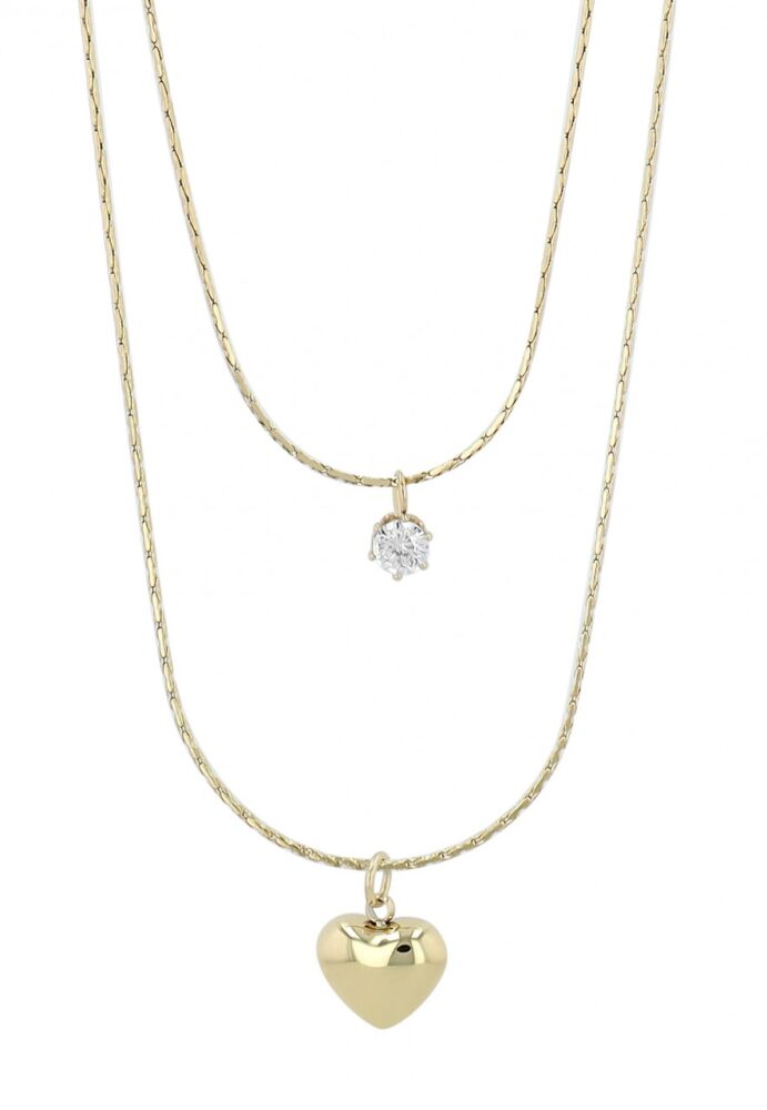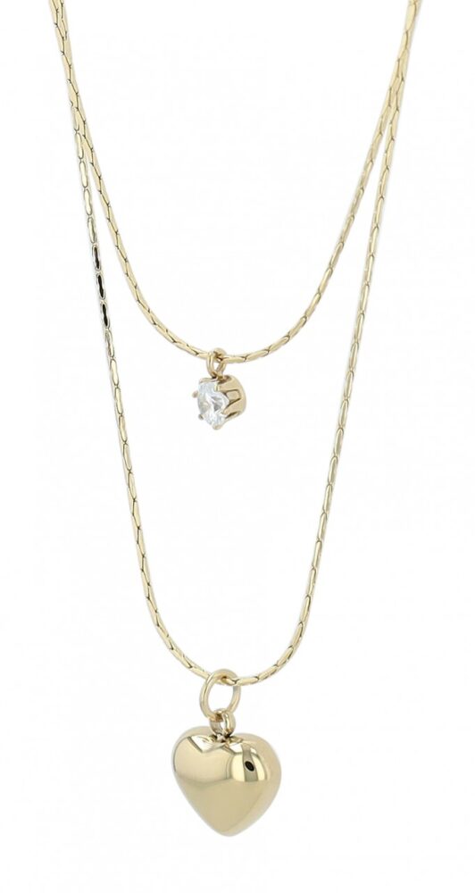 Este elegante colar de aço inoxidável com duas fileiras acrescenta toques de estilo com um pingente de coração em filigrana e zircônia brilhante. Os diferentes comprimentos de corrente (38 cm e 42 cm) criam um efeito de camadas moderno que enfatiza o decote de forma elegante. Graças à extensão de 5 cm de comprimento, a corrente pode ser ajustada individualmente e combinada de diversas maneiras – seja como um destaque romântico ou como uma peça moderna e marcante. Seu design atemporal o torna o companheiro perfeito para qualquer ocasião.