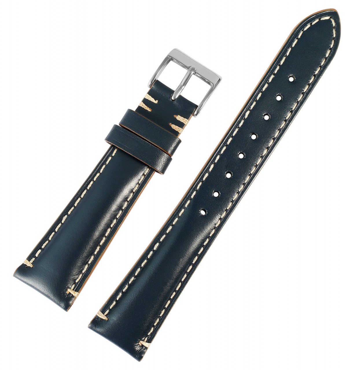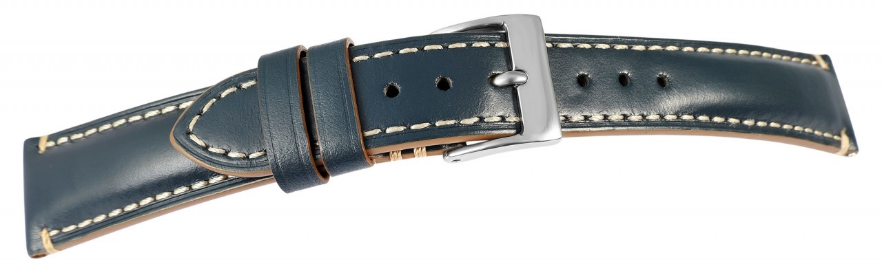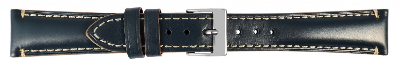Das dunkelblaue Uhrenarmband aus Echtleder erhalten Sie in unserem Großhandel in den Anstoßbreiten 18 mm, 20 mm und 22 mm . Die glatte Oberfläche, die Naht und die teilweise Polsterung machen dieses Uhrenarmband zu einem echten Allrounder. Die Anstoßbreite und der Schließenanstoß haben unterschiedliche Maße, da das Uhrenarmband sich zur Schließe hin verjüngt. Die Materialstärke beträgt im gepolsterten Bereich 5 mm. Es lässt sich mit einer silberfarbenen Dornschließe aus Edelstahl öffnen und schließen.