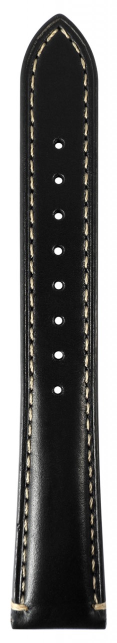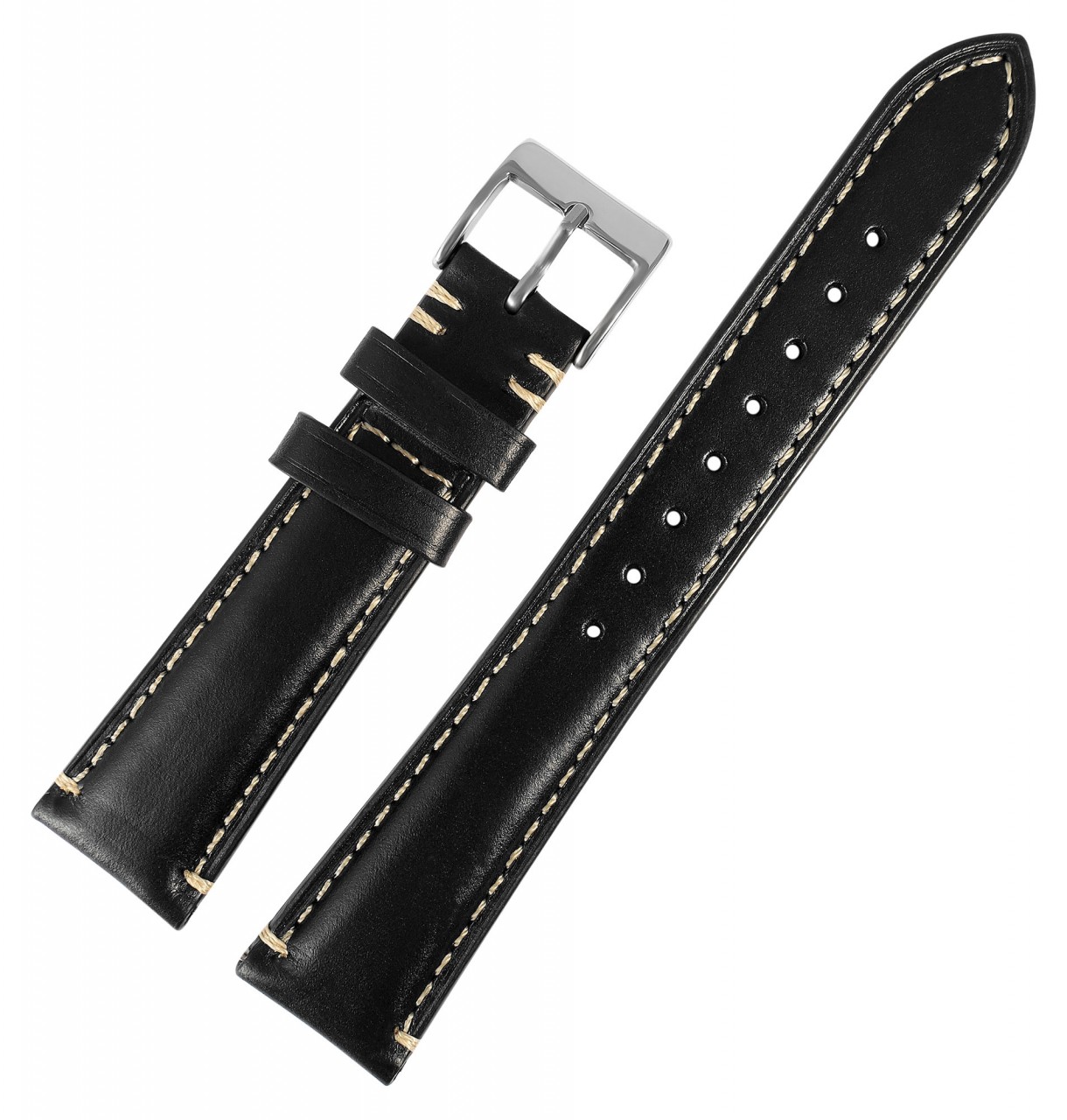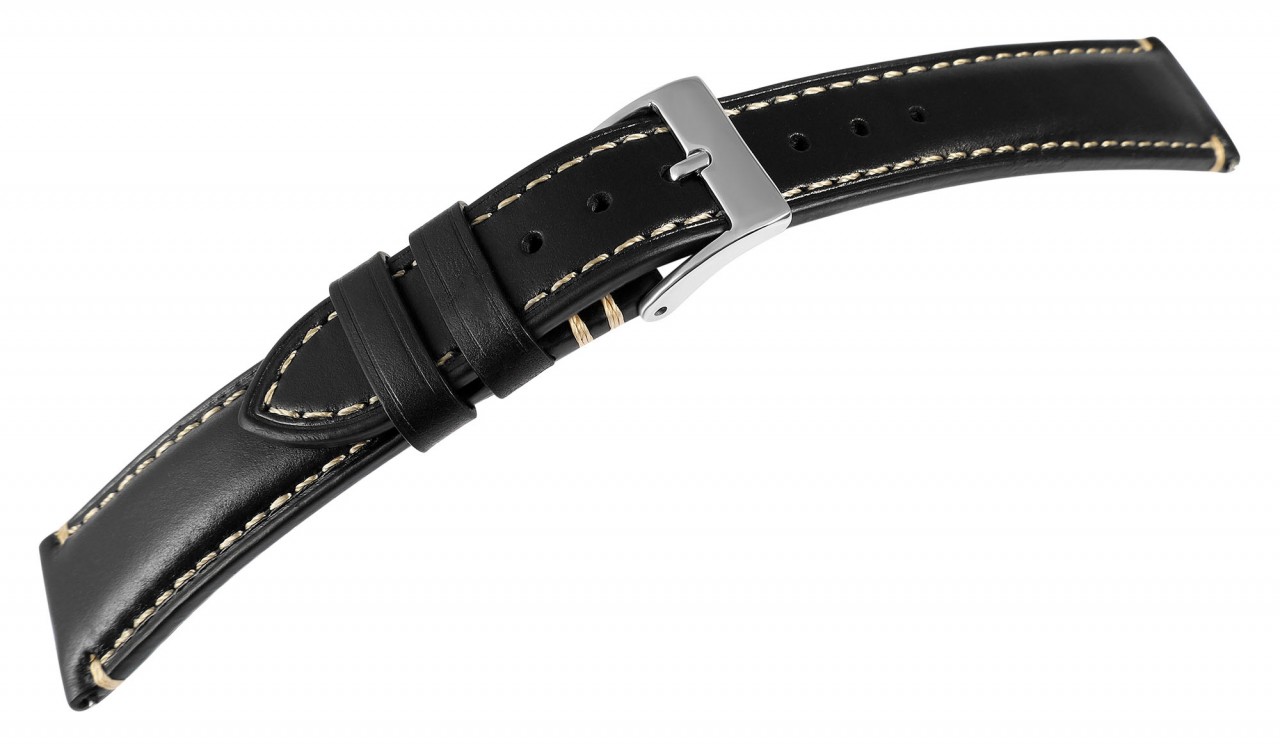 Aus Echtleder erhalten Sie dieses schwarze Uhrenarmband in unserem Großhandel in Anstoßbreiten 18 mm, 20 mm und 22 mm . Die glatte Oberfläche, die teilweise Polsterung und die Naht machen dieses Uhrenarmband zu einem echten Allrounder. Die Anstoßbreite und der Schließenanstoß haben unterschiedliche Maße, da das Uhrenarmband sich zur Schließe hin verjüngt. Die Materialstärke beträgt im gepolsterten Bereich 5 mm. Das Uhrenarmband lässt sich mit einer silberfarbenen Dornschließe aus Edelstahl öffnen und schließen und es hat zwei Armbandschlaufen.